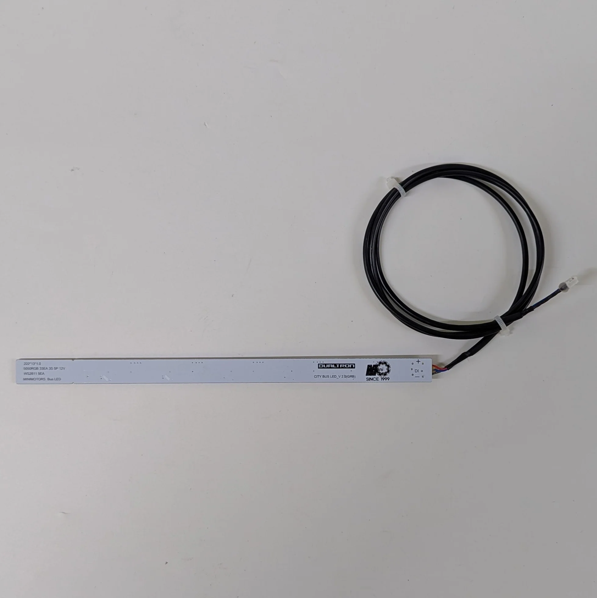 Compatible with model Dualtron City / City NEW. RGB LED light bar, 22 cm length with 90 cm cable and 3-pin connector, installed on the deck/body for decorative lighting. PCB marked “DUALTRON”, “CITY BUS LED V2.0 (GRB)”, “MINIMOTORS Bus LED”, “SINCE 1999”.